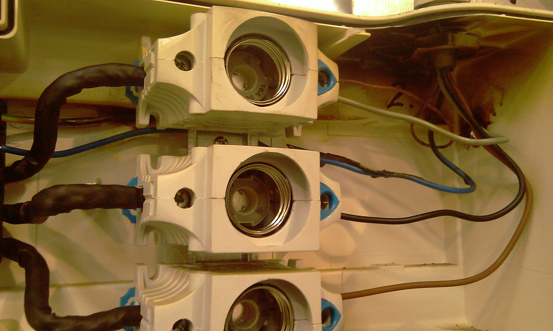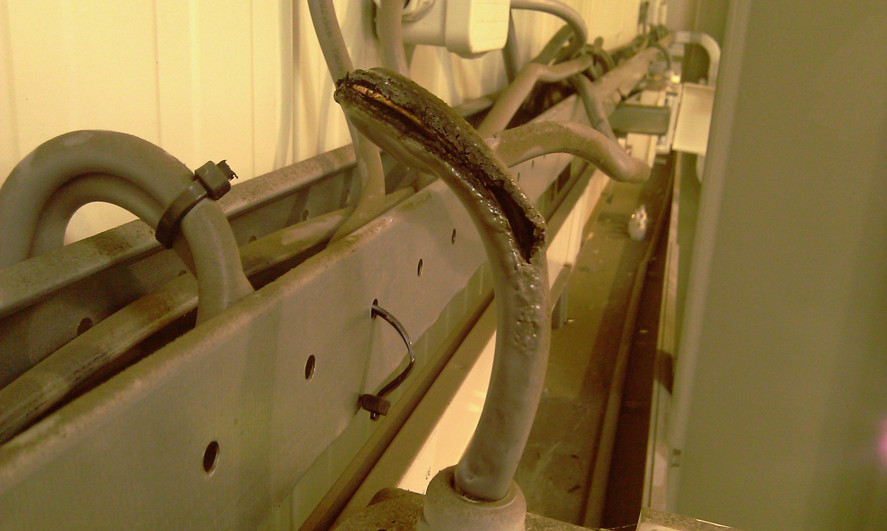 In bovenstaande foto is rechts boven een kabel zichtbaar waarvan de isolatie is gesmolten. De kerntemperatuur van de (koperen) geleider mag bij normaalbedrijf maximal 70 à 90 graden Celsius bereiken en dat vinden wij al zeer hoog. Hier was de temperatuur veel hoger.