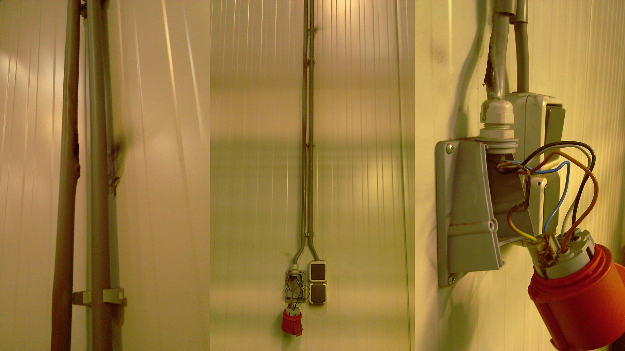 Bovenstaand een montage van 3 foto’s. Links en in het midden is te zien dat de groengele ader op meerdere plaatsen uit de mantel van de kabel is getreden. Vaak zie je in de krant “brand door kortsluiting” en dat is vaak onzin.