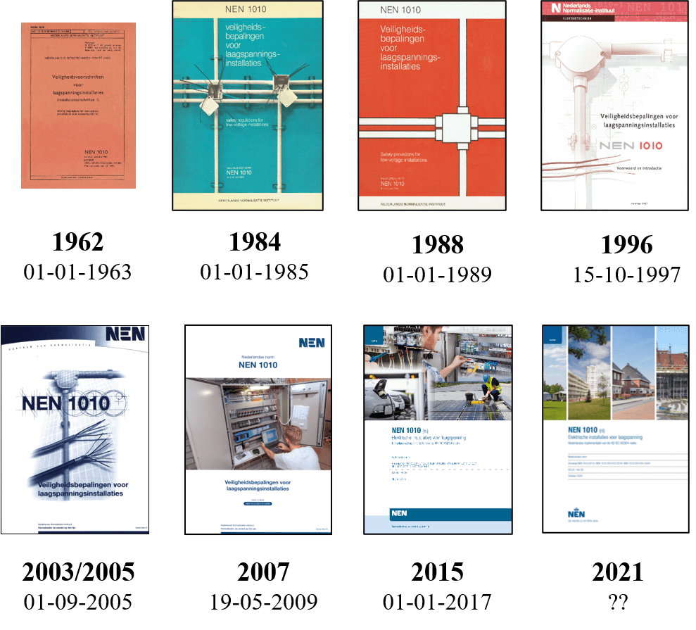 In de bovenstaande afbeelding is de lange historie van de NEN 1010 af te lezen. De eerste druk is vervallen en niet afgebeeld. We beginnen met de tweede druk uit 1962.