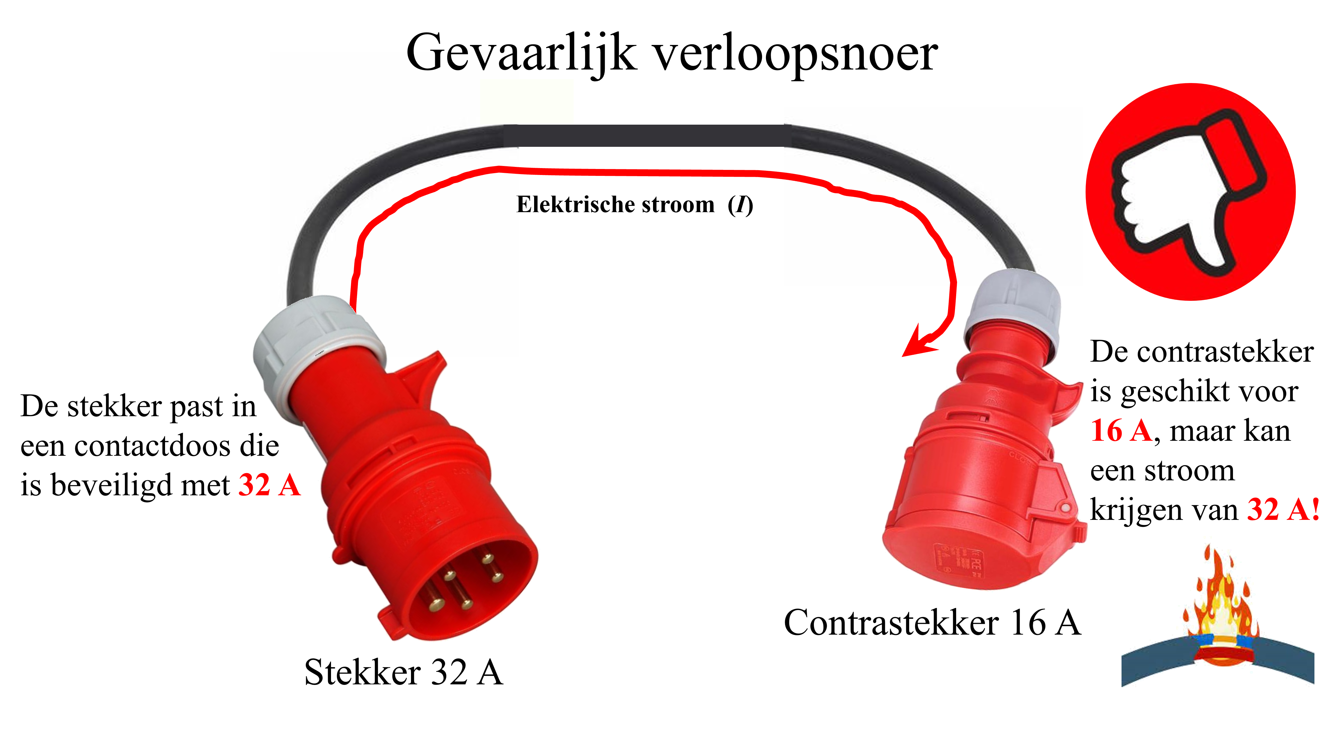Dir voorbeeld is ongevaarlijk omdat de contrastekker de maximaal de helft van de elektrische stroom toegevoerd kan krijgen dan de stroom waarvoor deze contrastekker is geschikt. Dat betekent wel dat het apparaat dat op deze contrastekker wordt aangesloten ook maximaal 16A kan opnemen. Dat is wel wat onlogisch als er een 32A stekker aan dat apparaat zit….