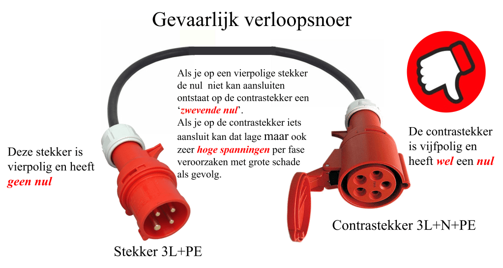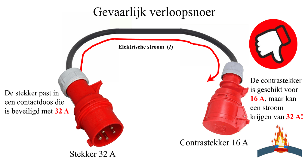 Het is onbegrijpelijk dat je bij een aantal webshops dit soort ‘handige’ verloopsnoeren kan bestellen met een 32A stekker en een 16A contrastekker. Als de stekker ook 16A was geweest zou dat geen probleem zijn.
