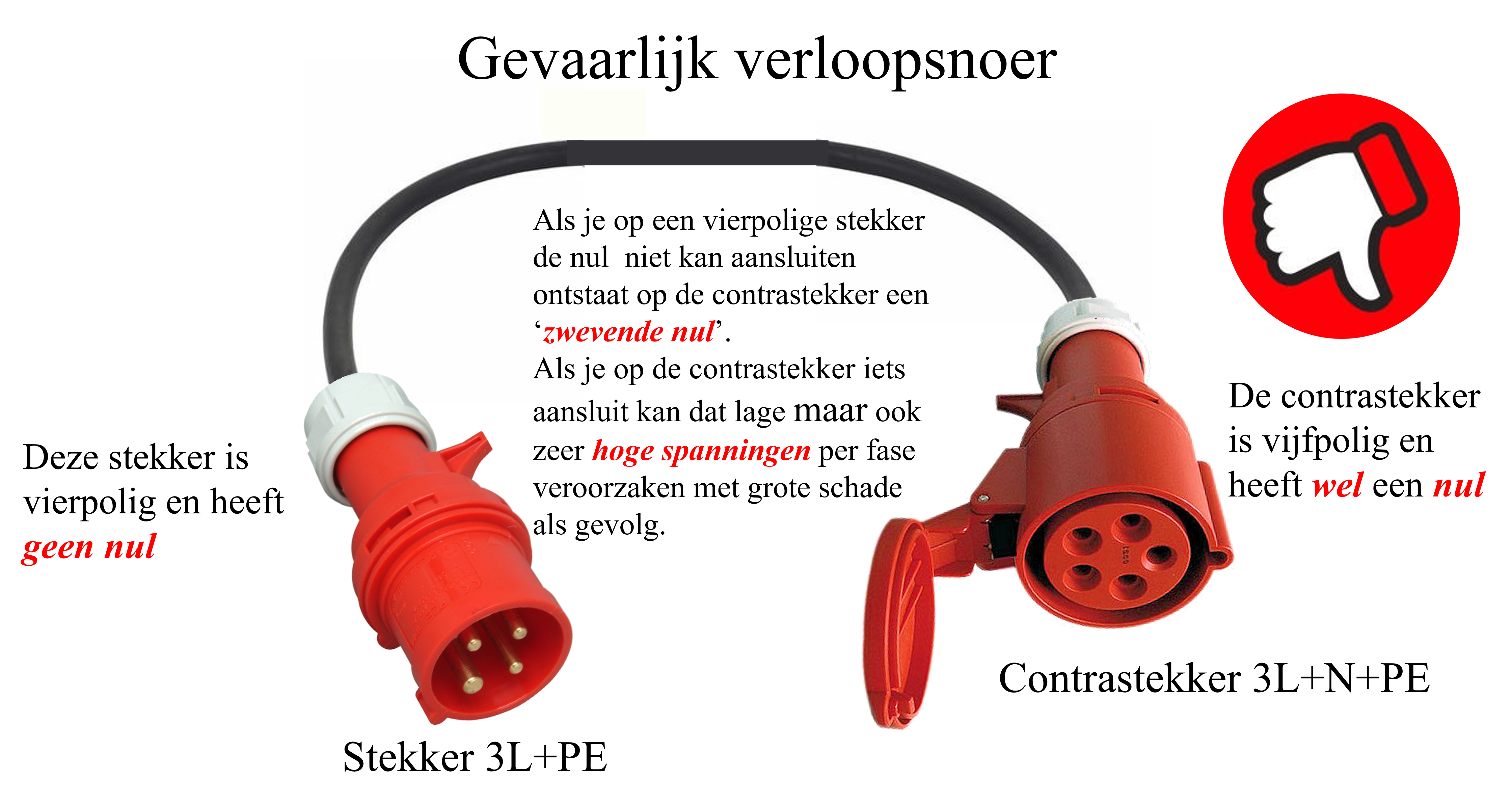 In de praktijk worden er veel driefasen verloopsnoeren gemaakt die soms ronduit gevaarlijk zijn. De inspecteurs die elektrsiche arbeidsmiddelen inspecteren komen veel in elkaar genkutselde verloopsnoeren tegen. Ook tijdens de keurmeestercursussen worden er veel vragen over geslend. Zie de volgende voorbeelden.