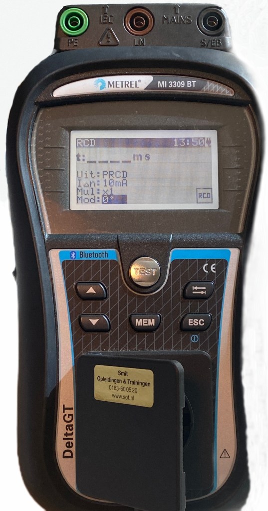 Als voorbeeld voor dit artikel wordt een Metrel tester (MI3309BT) gebruikt omdat deze ook een 10 mA-stand heeft voor het testen van (P)RCD’s.