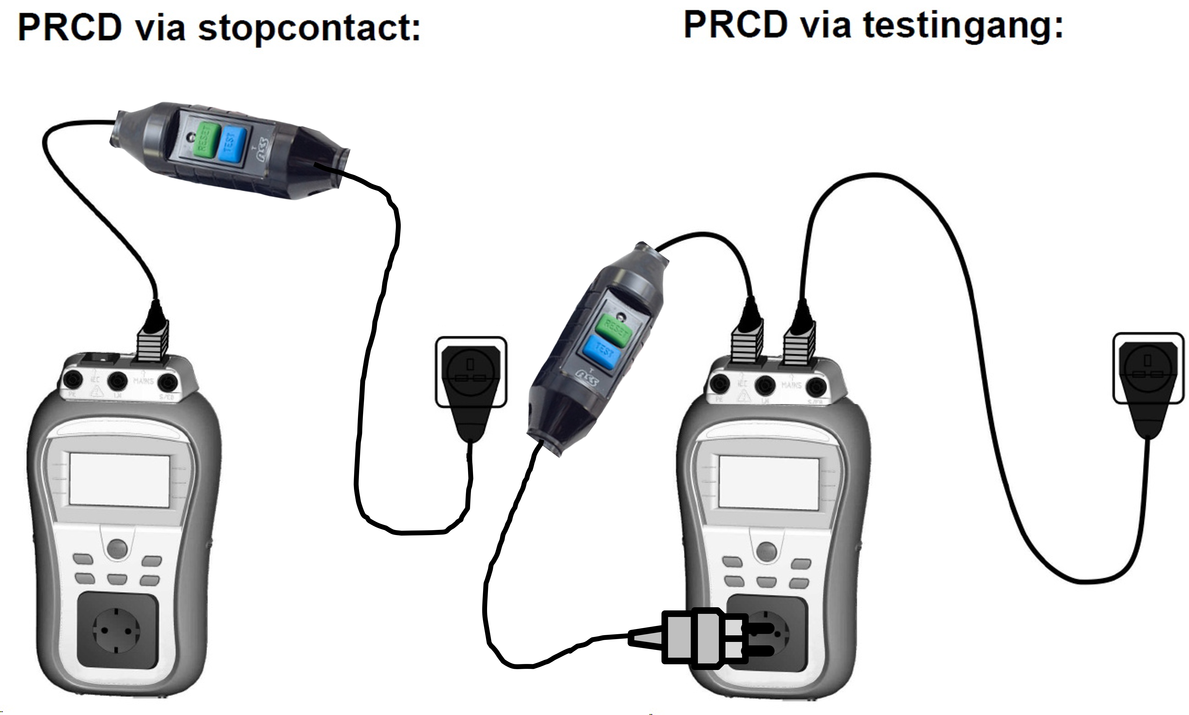 Bij de meting ‘PRCD via stopcontact‘ (wandcontactdoos) is de kans op onbedoeld uitschakelen van de 30 mA aardlekschakelaar in de elektrische installatie groter dan bij de meting ‘PRCD via testingang“. Daarom heeft de meting ‘PRCD via testingang’ de voorkeur.