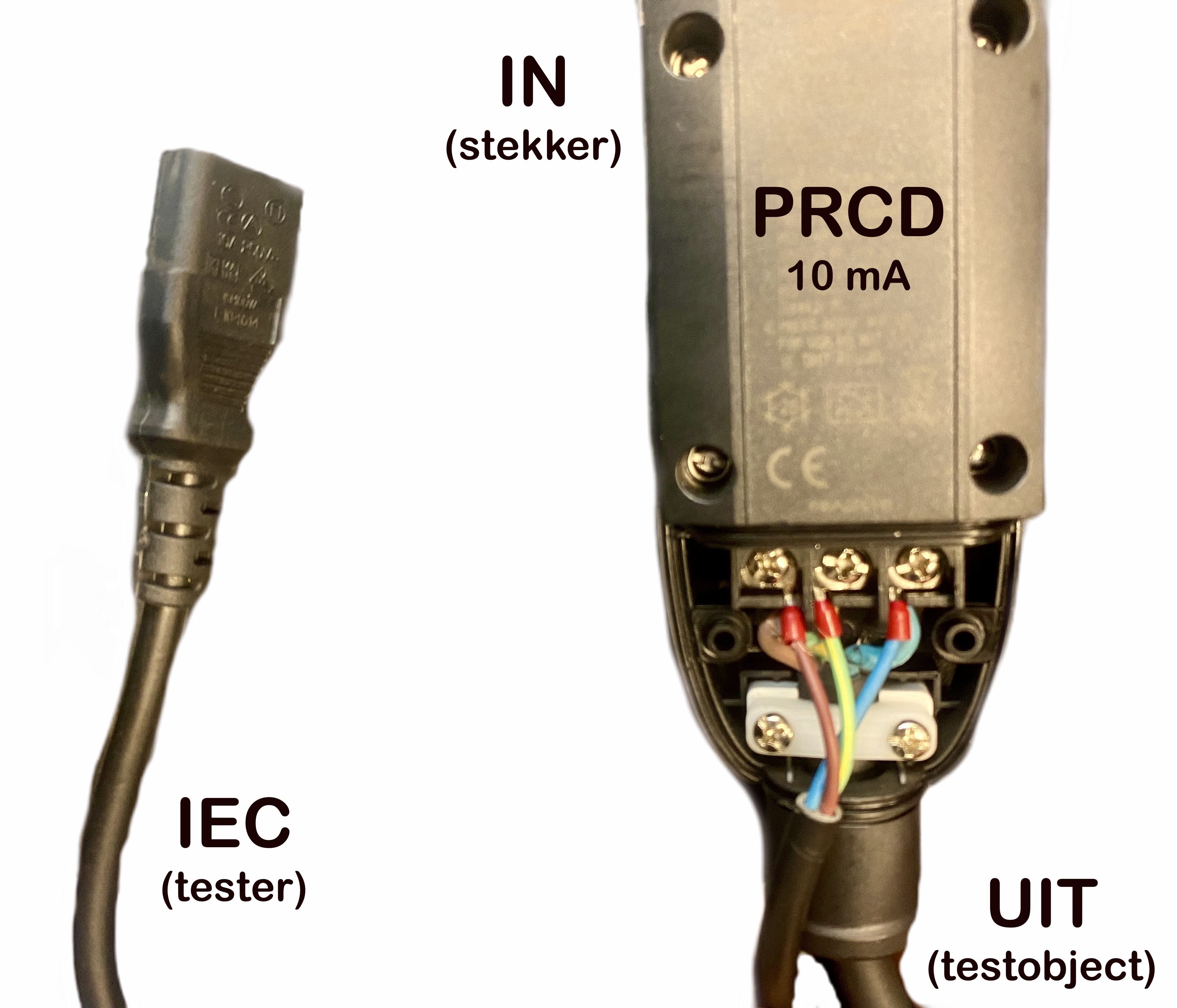 Het IEC-snoer wordt op de uitgaande kant van de PRCD aangesloten, dus aan de kant waar het apparaat of de machine zit.