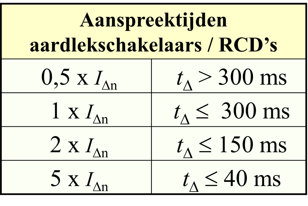 Bij de halve aanspreekstroom I∆n = 0,5 mA hoeft de PRCD niet uit te schakelen. Bij een vermenigvuldigingsfactor van 1 x I∆n = 10 mA moet de PRCD bij maximaal 300 ms aanspreken (uitschakelen). Dat is de meest gangbare meting. Als je twijfelt of je de PRCD wel/niet gaat goedkeuren kan je ook nog een vermenigvuldigingsfactor van 5 x I∆n proberen, dan moet de PRCD bij maximaal 40 ms aanspreken.