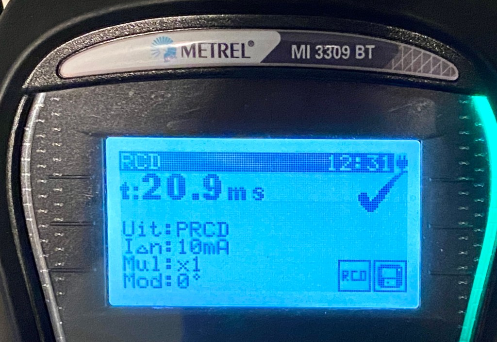 Na een druk op de testknop van de tester zendt de tester een constante meetstroom door de PRCD-schakelaar, waardoor de ingebouwde aardlekschakelaar aanspreekt/uitschakelt bij 20,9 ms. Dat is een goede meettijd, want de maximale aanspreektijd is 300 ms.