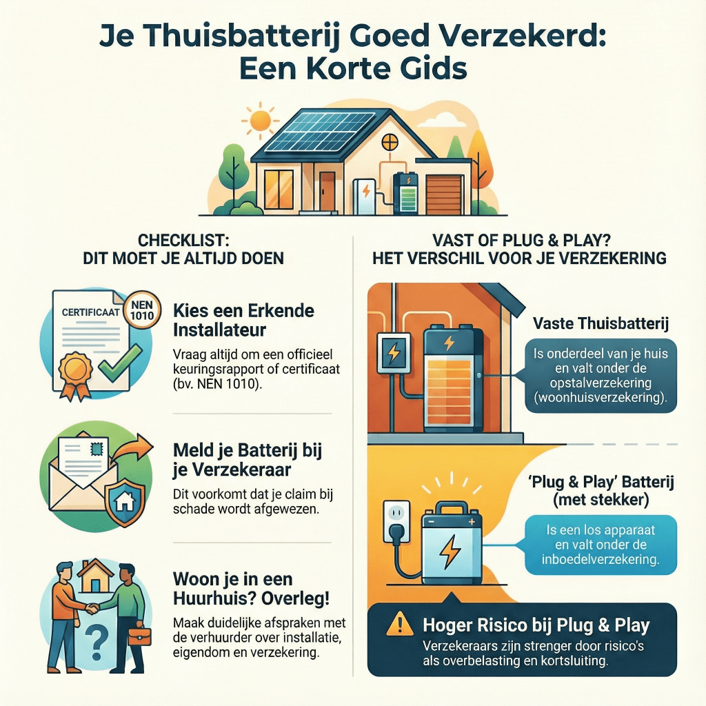 Een enkele thuisbatterij met een stekker met beperkte capaciteit is meestal wel toelaatbaar. Maar ga zeker geen thuisbatterijen met een stekker koppelen!