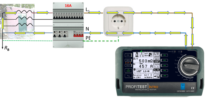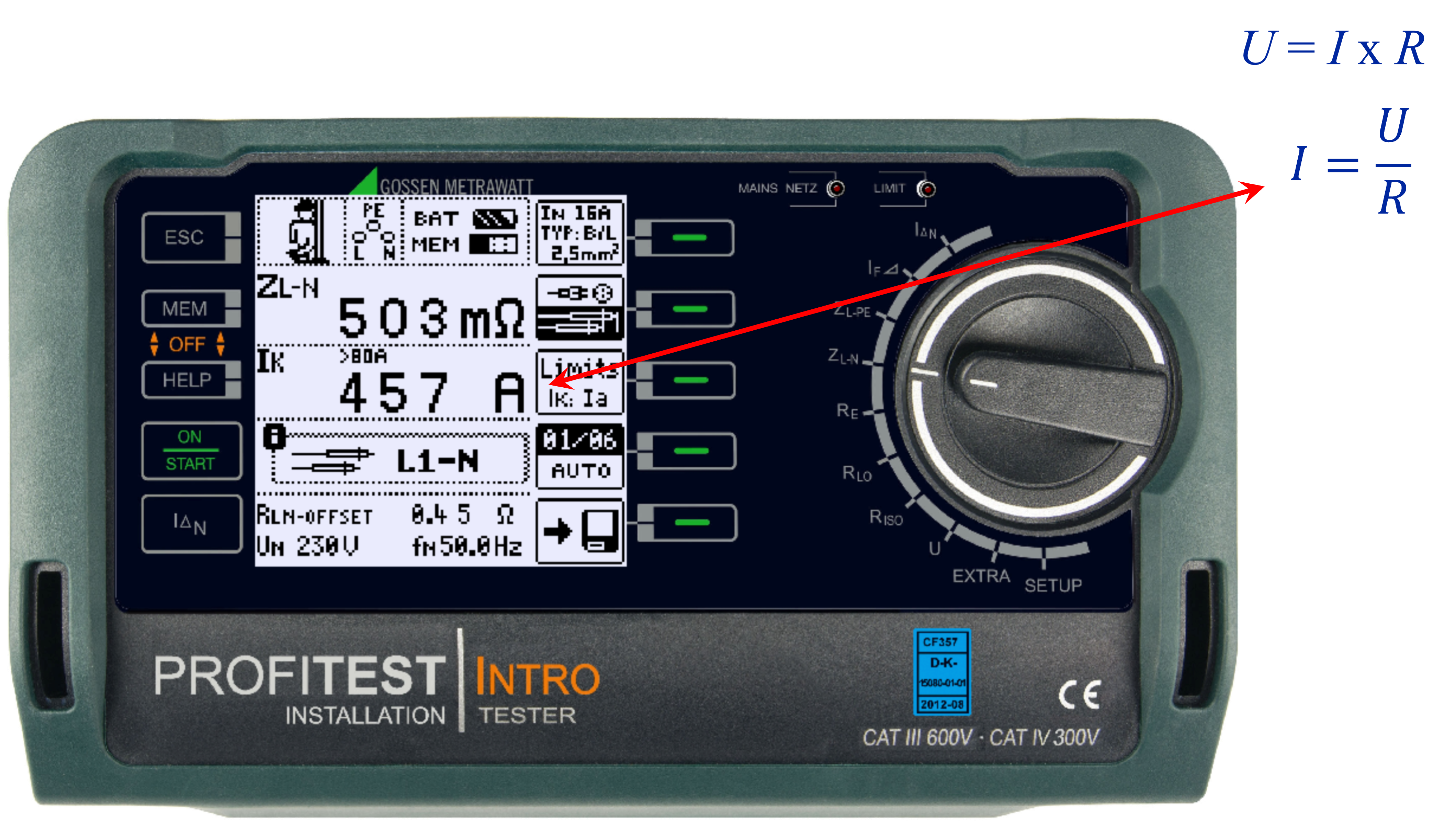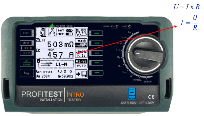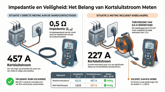 De netimpedantie (‘lusweerstand’) van de elektrische installatie wordt gemeten tussem de lase en de nul: ongeveer 0,5Ω (Ohm). De tester berekent een kortsluitstroom van 457 Ampère. Dat is niet gevaarlijk want de B-automaat van 16A in de groepenkast heeft minimaal 80A nodig om tijdig af te schakelen bij een kortsluiting tussen fase en nul. Die 457A kortsluitstroom laat de automaat in recordtijd afschakelen en dat is veilig.