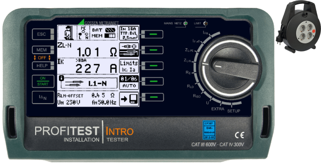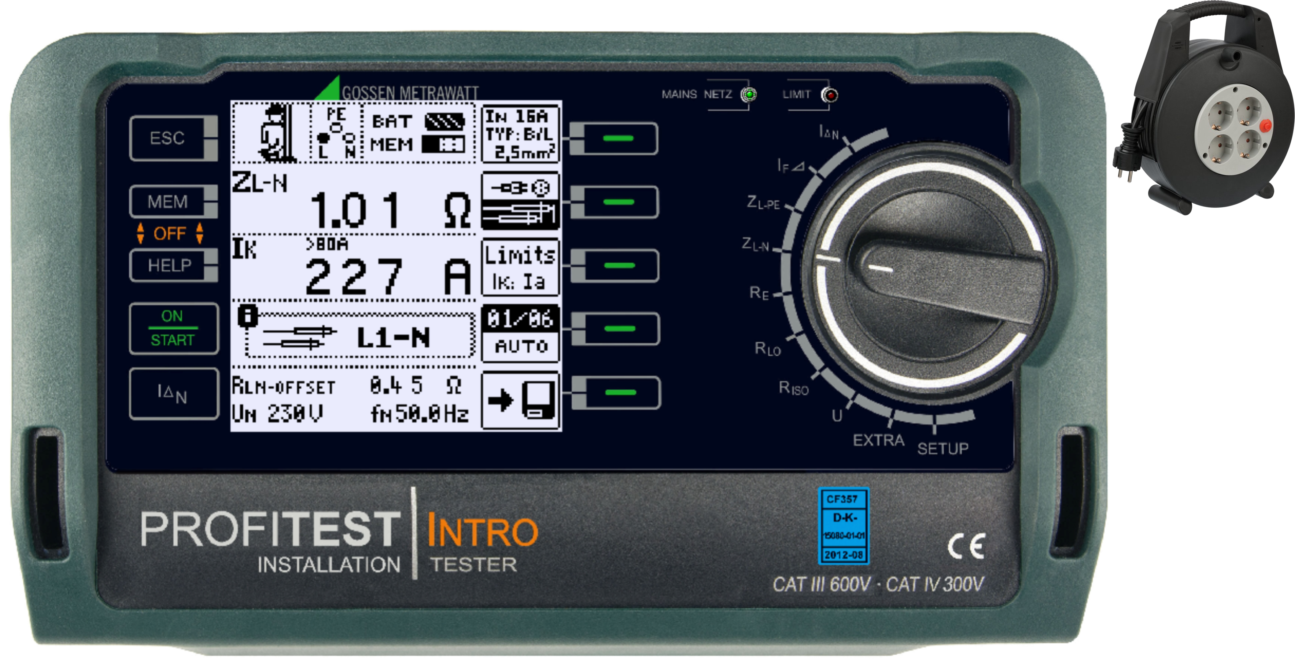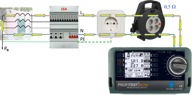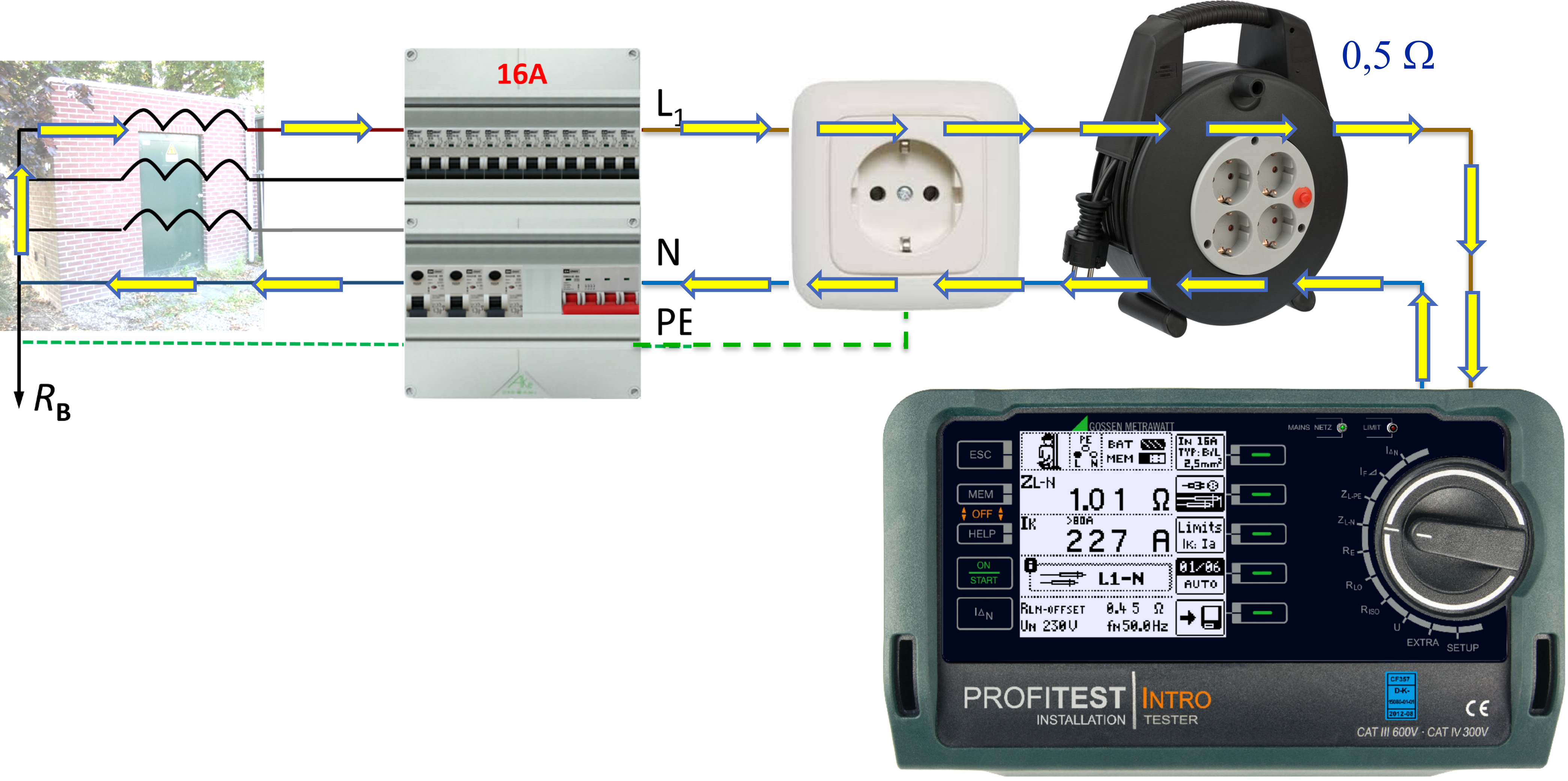 Nu is een kabelhaspel aangesloten. De bedrading van zo’n haspel heeft weerstand die mede afhankelijk is van de lengte van de kabel en de kerndoorsnede (‘dikte’) van de draden in de kabel. De weerstand van de bedrading L-N is 0,5Ω.